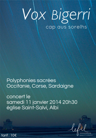La tournée de présentation du nouvel album de Vox Bigerri, Cap aus sorelhs, continue… Après Tarbes, Paris, Le Houga, Bordeaux et Perpignan, Vox Bigerri chantera à Albi puis à Rodez les 11 et 12 janvier 2014.