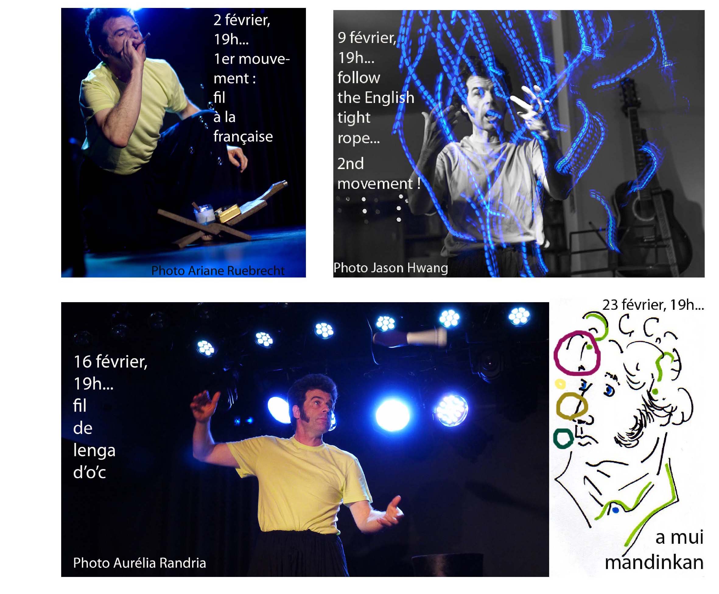 Les dimanches de février à la Péniche Didascalie à Ramonville (31), Philippe Sahuc propose quatre déclinaisons de sa performance Jonglage de langues, autour de quatre langues : le françias, l’anglais, l’occitan et le mandikan.
